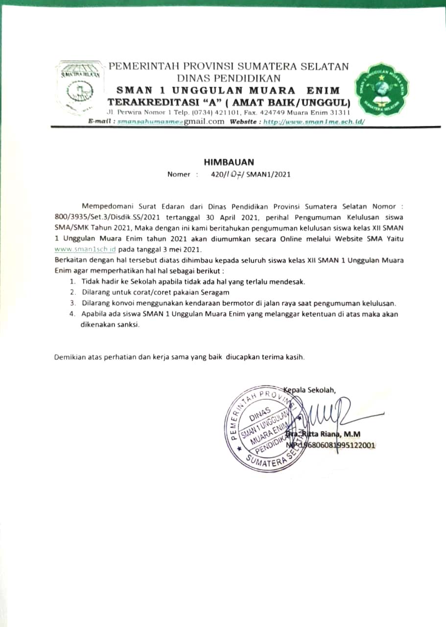 Penetapan Kelulusan Peserta Didik SMAN 1 Muara Enim Tahun Ajaran 2024/2025