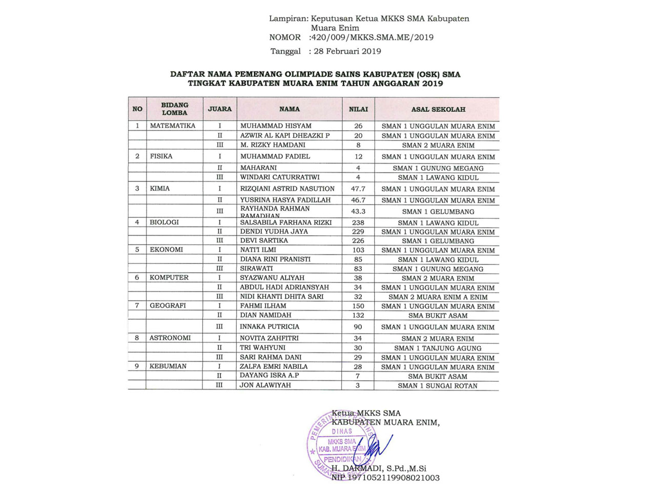 SMAN 1 UNGGULAN MUARA ENIM MEMBORONG JUARA OLIMPIADE SAINS NASIONAL TINGKAT KABUPATEN TAHUN 2016